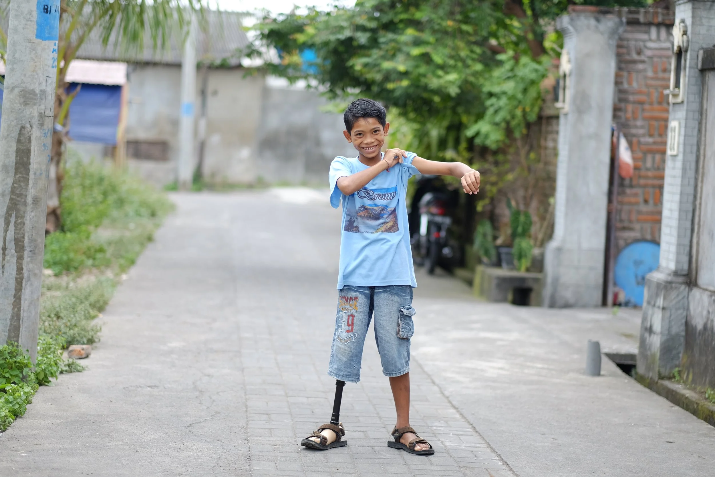 As a young child, Dwi lost his leg in a traumatic accident. Dwi’s parents, a security officer and flower vendor, were unable to save the money necessary to buy Dwi a single prosthetic limb, let alone afford the follow up costs that would incur as Dwi grew.